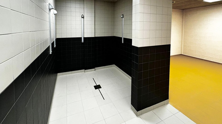 El sistema de pavimento se desarrolló con la colección Colourstyle, formato 30×30 cm y espesor 8,4 mm, combinada con rodapiés de 15×15 cm para asegurar una unión perfecta entre el suelo y la pared. La gama cromática —Ocra, Fumo, Panna y Antracite New— permite distinguir las áreas funcionales y mejorar la legibilidad visual de las zonas de agua mediante el contraste de luminancia. Las superficies Colourstyle, clasificadas de R10 a R12 según la variante, cumplen los requisitos de las categorías A-B-C de la norma EN 16165, ofreciendo una alta adherencia incluso en condiciones de humedad y un comportamiento constante a lo largo del tiempo.